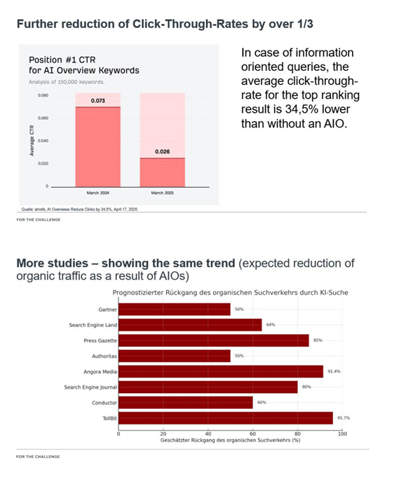Η απειλή για τους ευρωπαίους παρόχους ΜΜΕ είναι οξεία και συστημική. Η Google αξιοποιώντας τις πλατφόρμες που κατέχουν κυρίαρχη θέση στην αγορά της (Google Search, Android, Chrome) συγκρατεί ολοένα και περισσότερο την επισκεψιμότητα εντός του δικού της οικοσυστήματος. Κατά το παρελθόν, οι χρήστες οδηγούνταν στους αρχικούς εκδότες, υποστηρίζοντας την επισκεψιμότητα και τα έσοδα των εκδοτών. Σήμερα, τα εργαλεία με βάση την AI μειώνουν δραστικά την παραπομπή επισκεψιμότητας: εμπειρικά δεδομένα και μελέτες αγοράς (π.χ. από το Bloomberg τον Απρίλιο 2025) αναφέρουν μειώσεις άνω του 70% για εκδότες στις ΗΠΑ από τότε που παρόμοια εργαλεία κυκλοφόρησαν εκεί, ενώ άλλες προβλέψεις δείχνουν ακόμα πιο σοβαρές επιπτώσεις, έως και 97%.